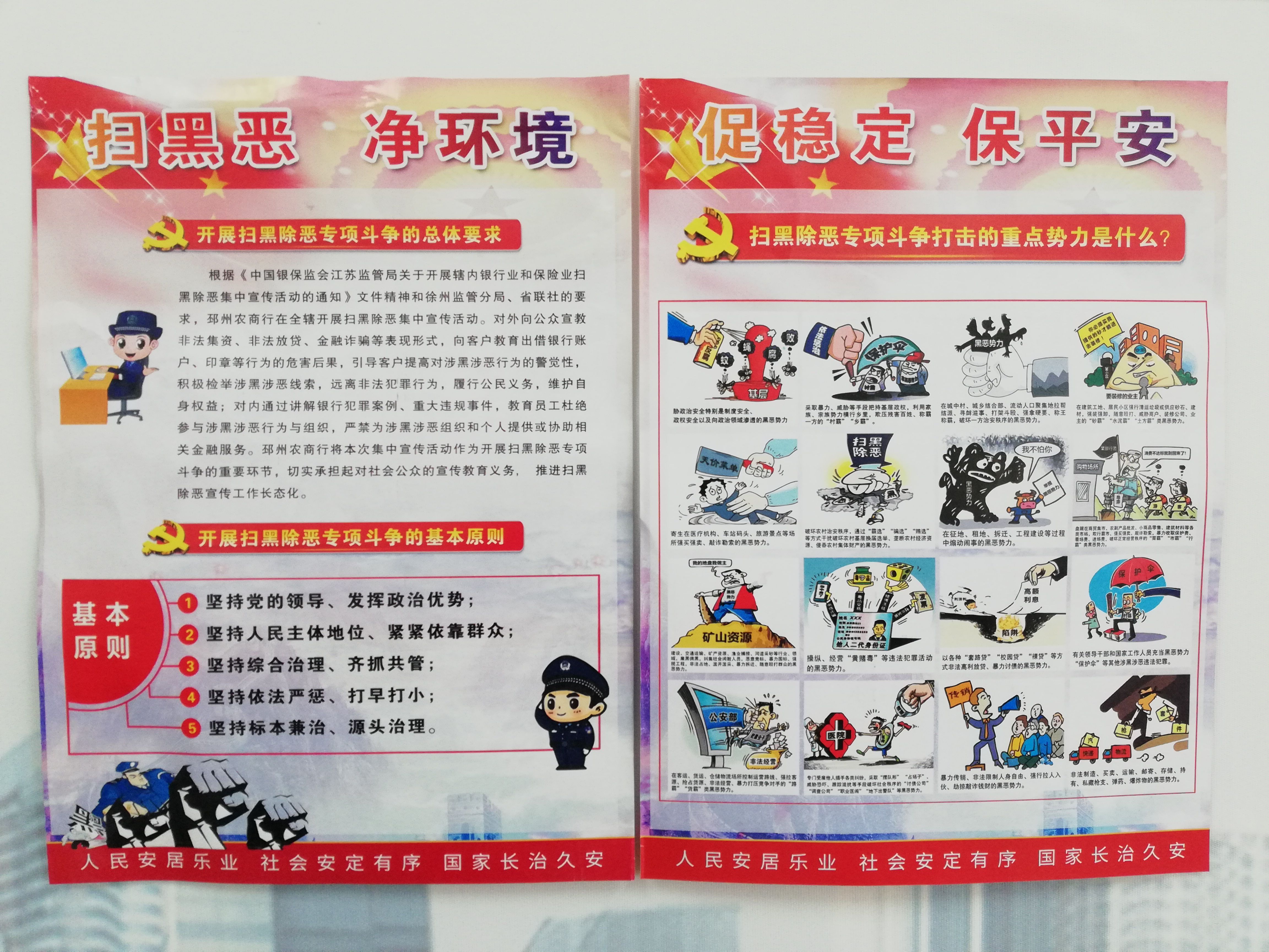 為認真貫徹落實《中國銀保監(jiān)會關于銀行業(yè)和保險業(yè)做好掃黑除惡專項斗爭有關工作的通知》(銀保監(jiān)發(fā)〔2018〕45號)、《中國銀保監(jiān)會江蘇監(jiān)管局關于開展轄內銀行業(yè)和保險業(yè)掃黑除惡集中宣傳活動的通知》(蘇銀保監(jiān)發(fā)〔2019〕58號)文件精神,根據徐州監(jiān)管分局和省聯(lián)社的工作要求,邳州農商銀行持續(xù)開展掃黑除惡專項排查及宣傳活動。