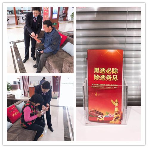 三是加強內外宣教,持續(xù)掃黑除惡。對內通過晨會、夕會、簡報、警示教育會議以及典型案例教育全行干部員工嚴禁參與任何涉黑涉惡組織活動,嚴禁為涉黑涉惡組織和個人提供或協(xié)助相關金融服務。對外向公眾宣教非法集資、金融詐騙、非法放貸等表現形式,引導客戶提高對涉黑涉惡行為的警覺性,積極檢舉涉黑涉惡線索,遠離非法犯罪行為,履行公民義務,維護自身權益。